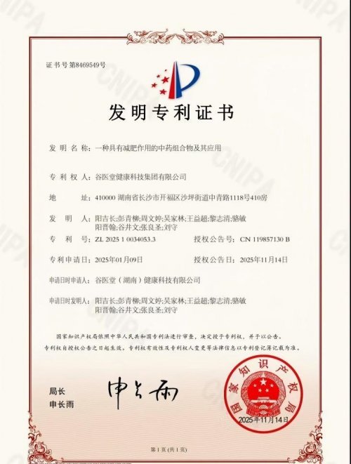 正文:近日,谷医堂科研团队自主研发的“一种具有减肥作用的中药组合物及其应用”正式获得国家知识产权局授权(发明专利号:ZL 202510034053.3),该组合物凭借独特配伍、显著疗效和高安全性,为肥胖人群提供了全新的中医调理解决方案,标志着谷医堂在中药减肥领域的研发实力获得重大突破。