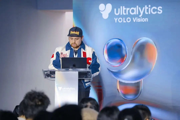 Ultralytics 创始人兼首席执行官Glenn Jocher带来了当天的首场主题演讲,分享了Ultralytics YOLO模型如何从一次研究突破,现在成长为全球最广泛应用的视觉人工智能模型之一。