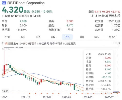 正文:今年以来,iRobot Corp(NYSE:IRBT)股价延续长期下行趋势,从2021年197.4美元的历史高点一路跌至近期最低1.4美元,市值较峰值蒸发超过99%。根据其披露的三季度报,公司资产负债表已出现明显失衡,总资产低于总负债,实质性进入资不抵债状态,同时可动用现金规模持续收缩,经营现金流亦维持负值。