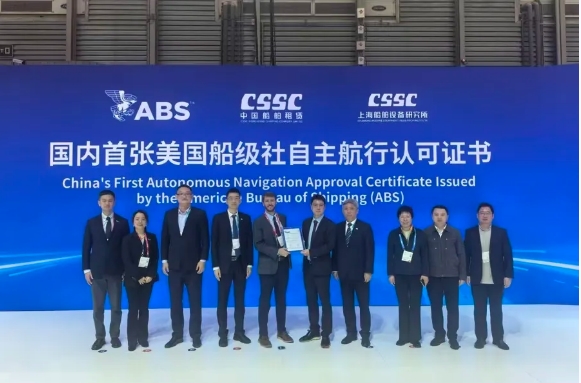 正文: 12月4日,在中国国际海事技术学术会议和展览会现场,中国船舶集团(香港)航运租赁有限公司自主经营的82000吨散货船“CS JINAN”轮获得美国船级社(ABS)颁发的中国首张自主航行认可证书,这也是全球首艘远洋散货船获得的ABS船级社自主航行认可证书,被业界誉为全球散货船自主航行发展的重要里程碑,将为行业树立新的技术标杆。“CS JINAN”轮搭载的是中国船舶集团第七〇四研究所自主研发的自主航行系统,ABS在认证过程中对该套系统进行了全面且严苛的实船测试,并认可该系统在可靠性、安全性及智能化水平等核心指标方面均达到国际领先标准。该套自主航行系统的实船应用,将有效降低人为操作和航行安全风险,显著减轻船员工作负担,提升船东运营效率。“CS JINAN”轮也是全球首艘具备开阔水域自主航行能力的大型远洋散货船。