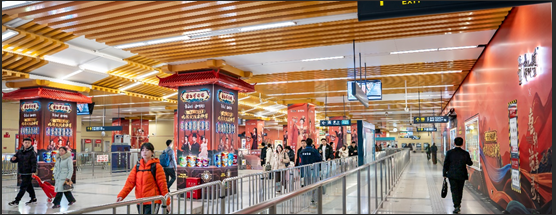 • 结构剧情化:对站厅立柱进行包柱视觉改造设计,部分结合唐代屋檐造型,打破平面局限,增强戏剧张力。这种设计使广告位不再是简单的信息展示,而是成为故事情境的延伸。