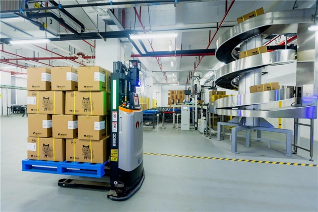 在葫芦娃药业美安儿童智能制造基地,一条条自动化生产线高速运转,智能化机械手臂上下挥舞,一辆辆AGV智能运输小车来回穿梭。