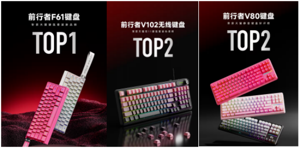 天猫平台上,前行者呈现“多点开花”态势。X87键盘蝉联无线键盘回购榜与好评榜双料第一;F61与x23的键鼠套装出道即登顶键鼠套装新品榜;V102无线键盘与V80键盘分别位列键鼠套装热卖榜TOP2与静音键盘好评榜TOP2,产品矩阵覆盖从主流到细分市场的多元需求。