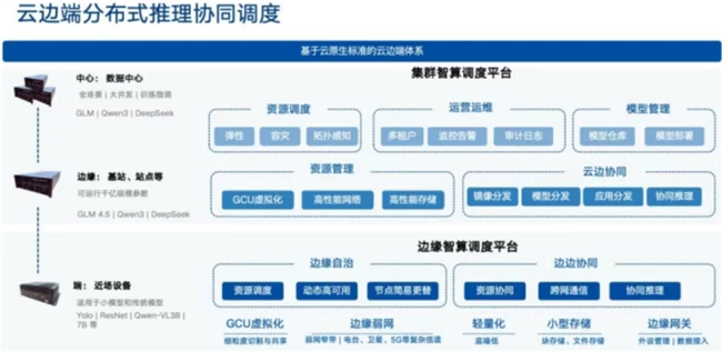 在软件方面,项目以品高智算云底座为核心,通过资源池化、协同调度、服务化交付与数据闭环四大核心能力,形成“云-边-端”协同推理体系,可将边缘侧计算平台和中心的算力设备,以及其中部署的应用进行协同调度,最终实现AI应用协同。