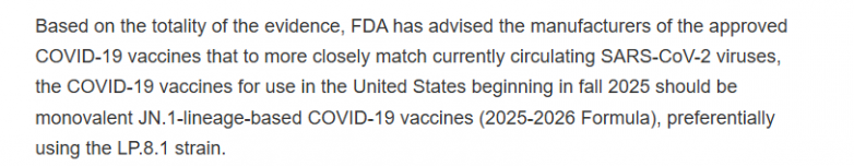 基于整体证据,FDA建议获批新冠疫苗制造商,为了更接近当前流行的SARS-CoV-2病毒,自2025年秋季起在美国使用的COVID-19疫苗应为单价JN.1谱系新冠疫苗(2025-2026配方),优先使用LP.8.1株。