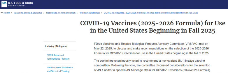 美国FDA疫苗及相关生物制品咨询委员会(VRBPAC)于2025年5月22日召开会议,讨论并就2025-2026年COVID-19疫苗配方的选择提出建议。
