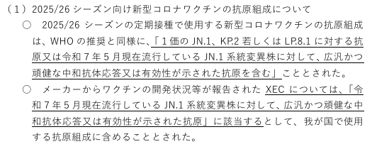 已确定应与世界卫生组织(WHO)的建议保持一致,即“包含针对单价JN.1、KP.2或LP.8.1的抗原,或包含那些已被证明能对截至2025年5月流行的JN.1谱系变异株产生广泛且有效的中和抗体反应或显示有效性的抗原”。决定将XEC纳入日本使用的新冠疫苗抗原成分之中。