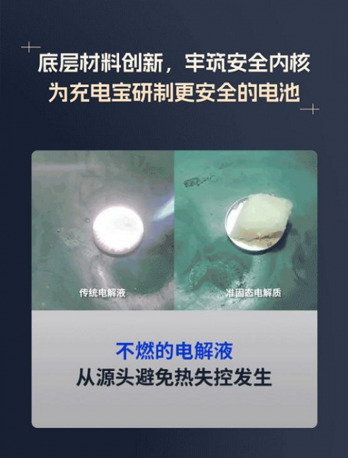 鹏辉能源最新推出的新一代移动电源半固态电池Secu系列,采用不燃电解液打造高安全半固态电池,精准匹配这一价值转变趋势。该电解液材料为鹏辉能源自研的高安全材料专利技术,可实现电解液的原位凝胶化,即使在极端情况下,也能做到不助燃、不自燃,有效避免移动电源电池热失控发生。