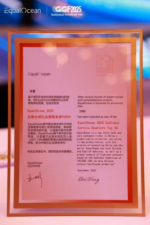 把握黄金十年,Zoho入选2025出海全球化品牌服务商TOP50榜单
