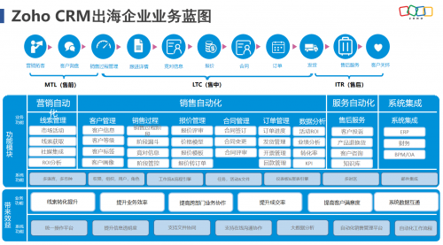 首先是产品优势,Zoho提供一体化解决方案,覆盖海外营销、销售跟进、客户管理、售后服务、HR、财务及定制开发各个环节,企业可以将业务整体运营到Zoho平台上,实现跨区域、跨业务、跨产品的流程高度整合。