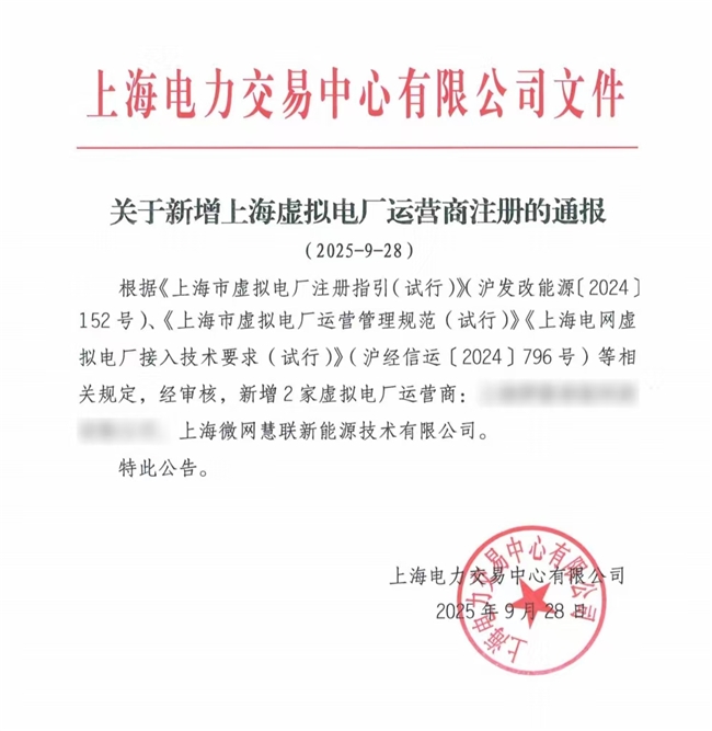 正文:当“双碳”目标与AI时代交汇,能源革命不再只是技术命题,更是城市治理与商业进化的共同考题。近日,上海电力交易中心有限公司正式通报,上海微网慧联新能源技术有限公司(以下简称 “微网慧联”)成功注册为上海市第 54 家虚拟电厂运营商,同时跻身浦东世博三林地区首批获此资质的企业行列。这张看似轻薄的牌照,实则撬动了“车-储-网”全链路的深度变革,也为超大城市如何以市场化、数字化手段守护电网安全提供了新的注脚。