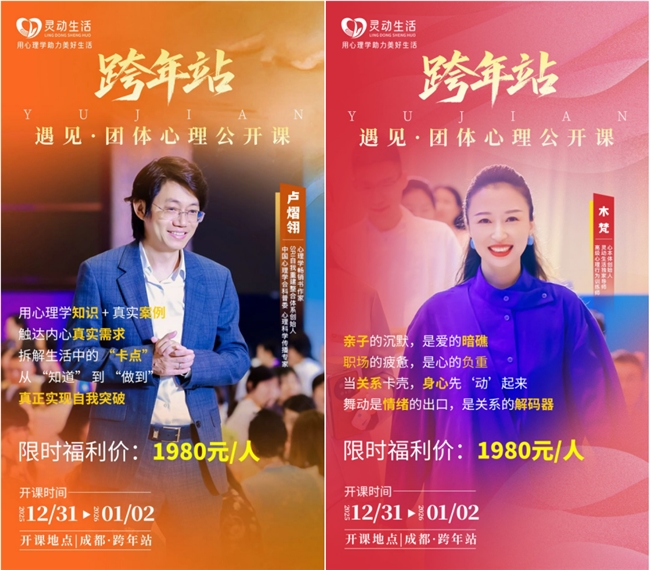 不同于传统的跨年聚会,这场公开课以“沉浸式心理成长”为特色,将辞旧迎新的仪式感融入专业心理服务。课程集结了灵动生活集团两大核心导师,形成“理论深度+身体实践”的双维教学模式。