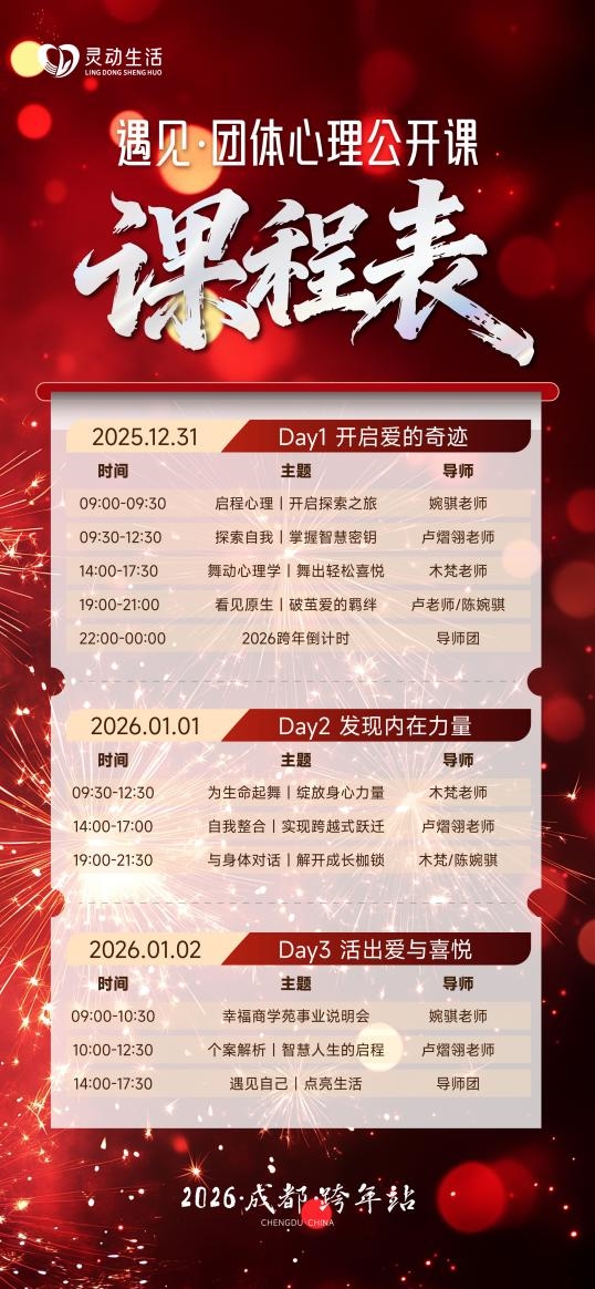 2025收官倒计时|灵动生活集团遇见团体心理公开课成都跨年,让我们一起拥抱2026
