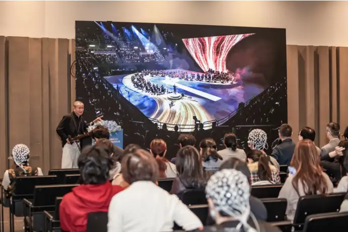 为了让与会者直观感受音乐与大脑的互动,会议设置了现场 EEG(脑电)采集实验环节。五位志愿者在佩戴脑电设备后,分别聆听了同一首“哭嫁歌”的录音版、现场人声版和 AI 改编版。大屏幕上实时滚动的脑电波形图与脑地形图,清晰展示了不同音乐形态如何激发大脑不同区域的活动,将“当声音触及大脑”这一主题从抽象概念转化为可见的数据波澜,成为连接艺术感性与科学理性的生动注脚。