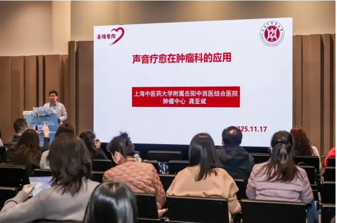 上海中医药大学附属岳阳中西医结合医院肿瘤一科(内科)主任龚亚斌教授结合临床实践阐述了声音疗愈在肿瘤科的应用。他展示了音乐疗法在缓解癌症疼痛、改善睡眠方面的确切疗效,并介绍了团队结合中医理论开发的“五行音乐”等创新方案。他强调,音乐疗愈已成为肿瘤综合治疗中不可或缺的一环。