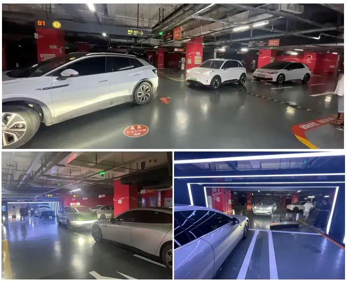 夜晚的停车场内,一台自动充电机器人缓缓启动,精准对位新能源车辆的充电口,为车主完成完整的补能服务。