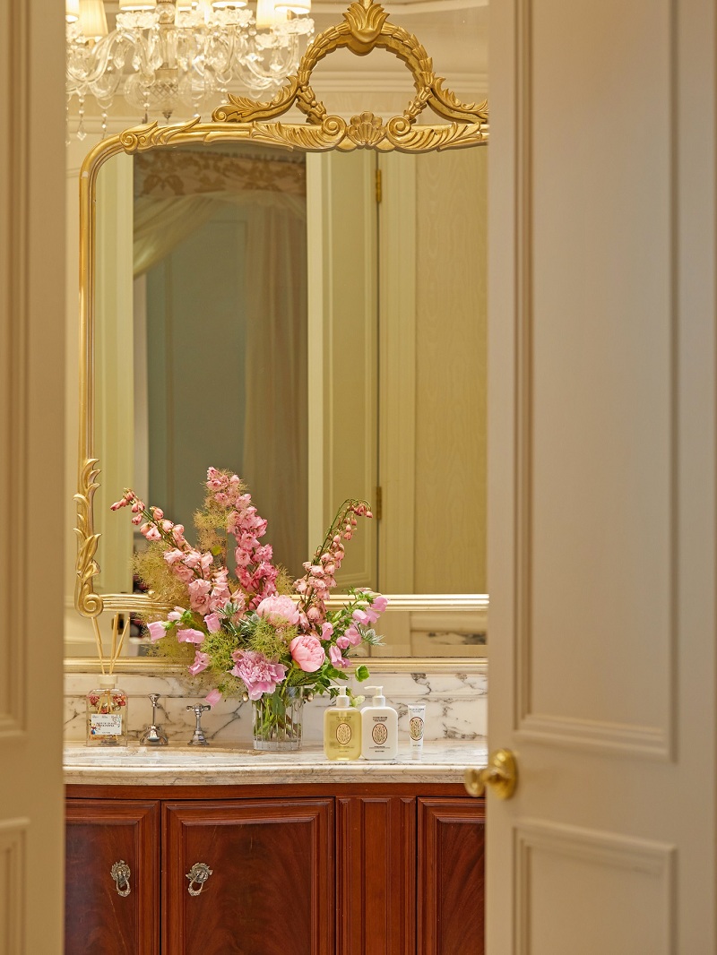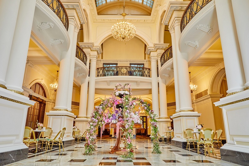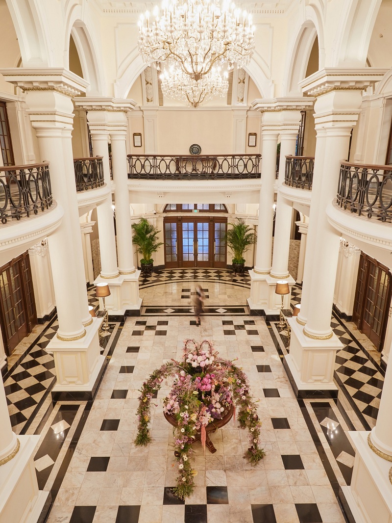 步入华丽的酒店大堂,耸立着缀有黑纹的白色云石及帕拉第奥式柱子,饶富 16 世纪意大利建筑韵味。大堂中间,一座巨大的花园喷泉伫立当中,运用芍药/玫瑰/飞燕/大丽花/惠兰等花材,点缀千叶玫瑰香囊和香氛,与华尔道夫酒店的水晶吊灯相相呼应。