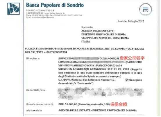 对于意大利站点销售量还不错的非深圳公司主体,需要等待我们税代资质成功获批后,才能通过为这类卖家去购买国债的方式来获取银行保函,开具的保函会同时包含卖家公司的名字以及税代的名字。所以,这类卖家请等待我们后续通知。