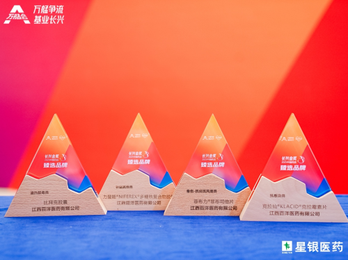 2025中国药店长兴金奖·甄选品牌(四项):抗感染类:克拉仙KLACID克拉霉素片:骨伤-抗炎抗风湿类:菲布力非布司他片;补益其他类:力蜚能NIFEREX多糖铁复合物胶囊;清热解毒类:比拜克胶囊。