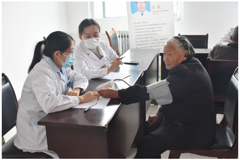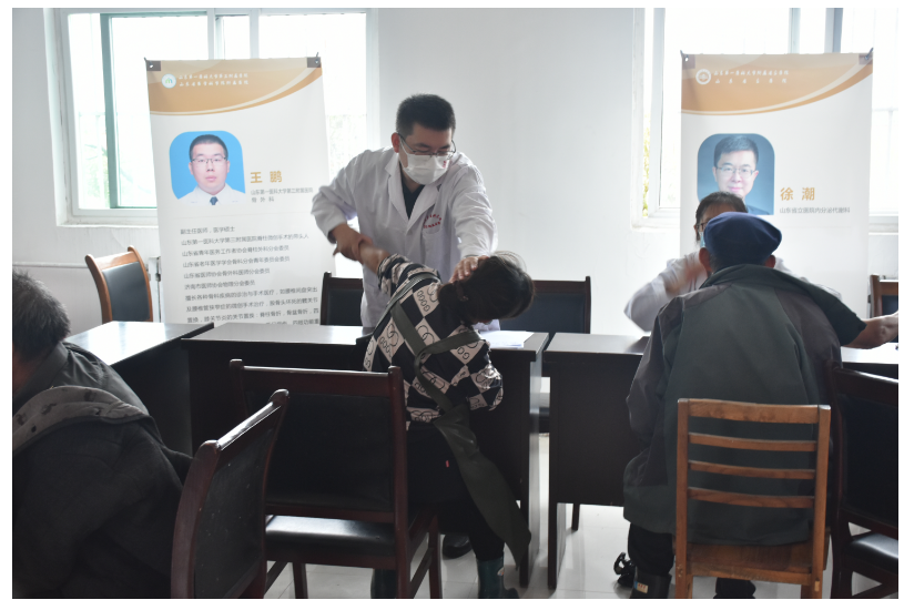 另一侧,山东省立医院泌尿外科索尼博士正为老年男性群体提供专项诊疗。“夜尿多、排尿不畅别忍着,这是前列腺增生的常见症状。”他通过细致问诊与触诊,为多位老人给出药物治疗建议和排尿习惯指导,缓解老人们的“难言之隐”。山东第一医科大学第三附属医院骨外科副主任医师王鹏则专注于关节检查,“您的膝关节退行性改变需要注意保暖,我教您几个护关节的动作”,他一边示范防跌倒技巧,一边为老人评估骨密度风险,现场传授关节养护知识。香城镇卫生院的4名护士配合调试设备、辅助检查,让义诊流程高效顺畅。