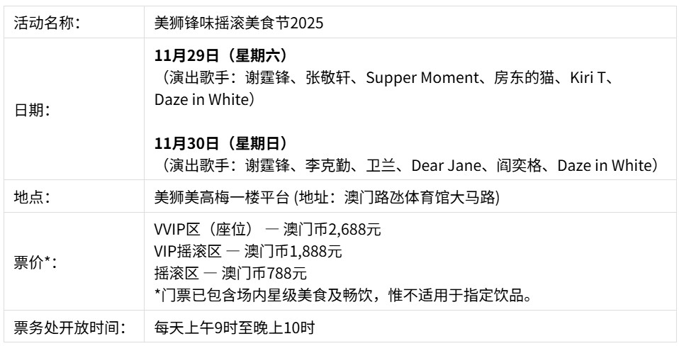 “美狮锋味摇滚美食节2025”将于11月29至30日在美狮美高梅一楼平台举行,门票由10月14日起于美高梅官网、大麦网、携程旅游、猫眼公开发售,票价由澳门币788元起。有关票务以及更多活动详情,请浏览美高梅官方网页。