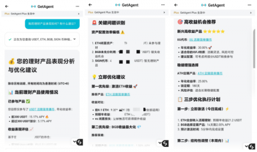 整体分析持仓后,你还可以进一步通过 GetAgent 分析你的理财产品。在给出收益表现评估后,GetAgent 会检查你持仓资产中可以参与的理财机会,并给出优先级,以及预估收益。此外,它还会推荐一些高收益机会,并给出时间线为两周的可执行方案。