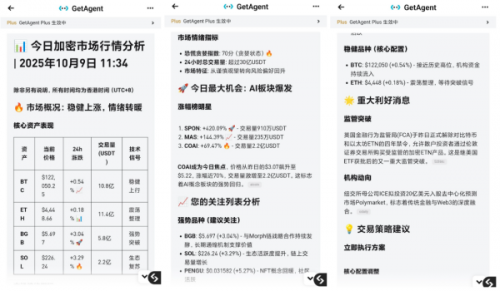 让 GetAgent 提供实时大盘走势分析、热门币种推荐,它会替你筛选 2-3 个新的交易机会,快速把握市场脉搏。