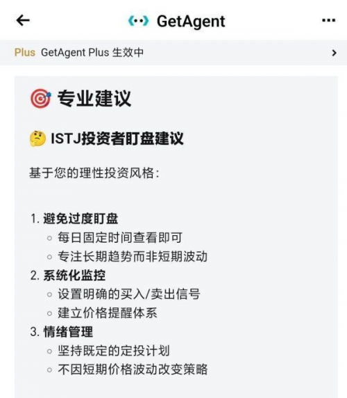 我在设置的过程中,GetAgent 还基于我的交易人格特质提醒我要避免过度盯盘,坚持既定的定投计划,不要因为短期的价格波动改变策略(真的非常贴心了!)。