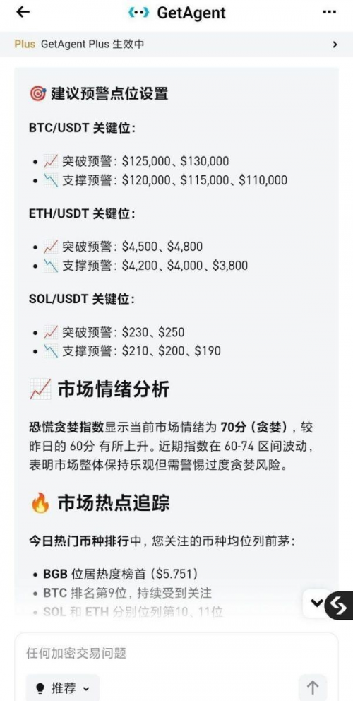 假期开始前,我们需要通过一些对话简单设置一下 GetAgent,以做好万全准备。登录 Bitget App,进入“常用功能”或资产页面,点击 GetAgent 聊天界面,即可自动解锁 Plus 版。这里有一个小 Tips,即在和 GetAgent 聊天时,尽量将相关问题集中在一个对话里,GetAgent 会结合上下文提供更好的解答和策略。