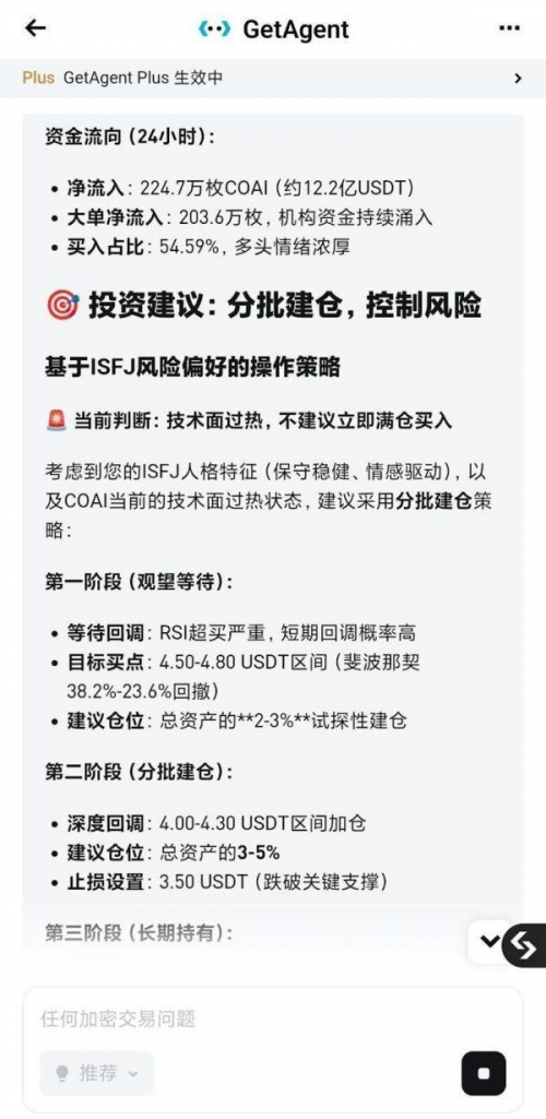 例如,下图为我让 GetAgent 在分析某个币种的基本面时,它在投资策略建议中会根据我的 ISFJ 的人格特质提供相应的操作策略: