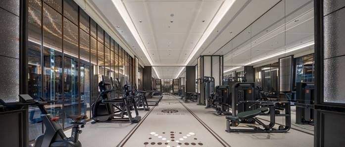 从现场外部看,大门奢华气派,约73米的艺术门廊,约9米挑高尺度,璀璨星空顶借意“俊采星驰”,幻影蓝花岗岩、普拉达绿奢石与爱马仕灰大理石等多种奢石匠造,这不仅是建筑大门,更是一座艺术装置。