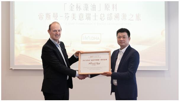 在现场嘉宾的共同见证下,Peter De Meester为天然博士颁发life’sDHATM金标授权牌,标志着天然博士是国内进口寇氏隐甲藻(T 油)life’sDHATM金标的唯一授权品牌。