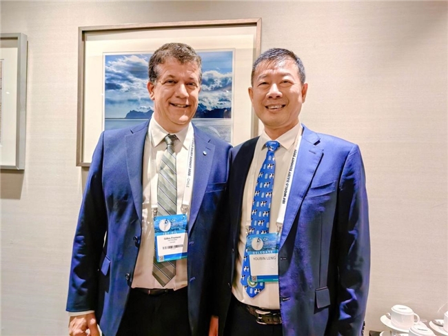 (冷友斌与国际乳品联合会主席合影。左起:国际乳品联合会主席Gilles Froment,中国飞鹤董事长冷友斌)