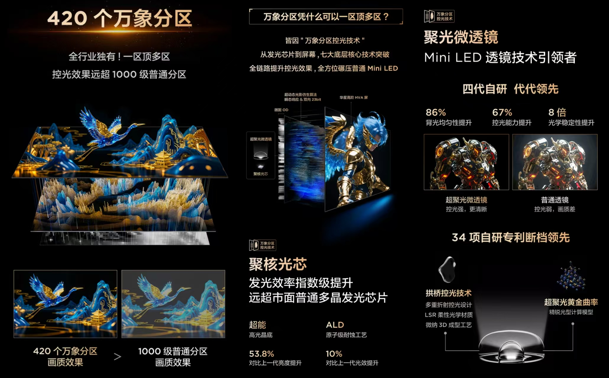 聚核光芯发光效率指数级提升,远超市面普通多晶发光芯片,超能高光晶体对比上一代光效提升53.8%,ALD原子级耐蚀工艺对比上一代亮度提升10%。同时,作为Mini LED透镜技术引领者,34项自研专利断档领先,其采用的聚光微透镜,通过四代自研实现遥遥领先:背光均匀性提升86%、控光能力提升67%、光学稳定性提升8倍,全链路提升控光效果,全方位碾压普通Mini LED。