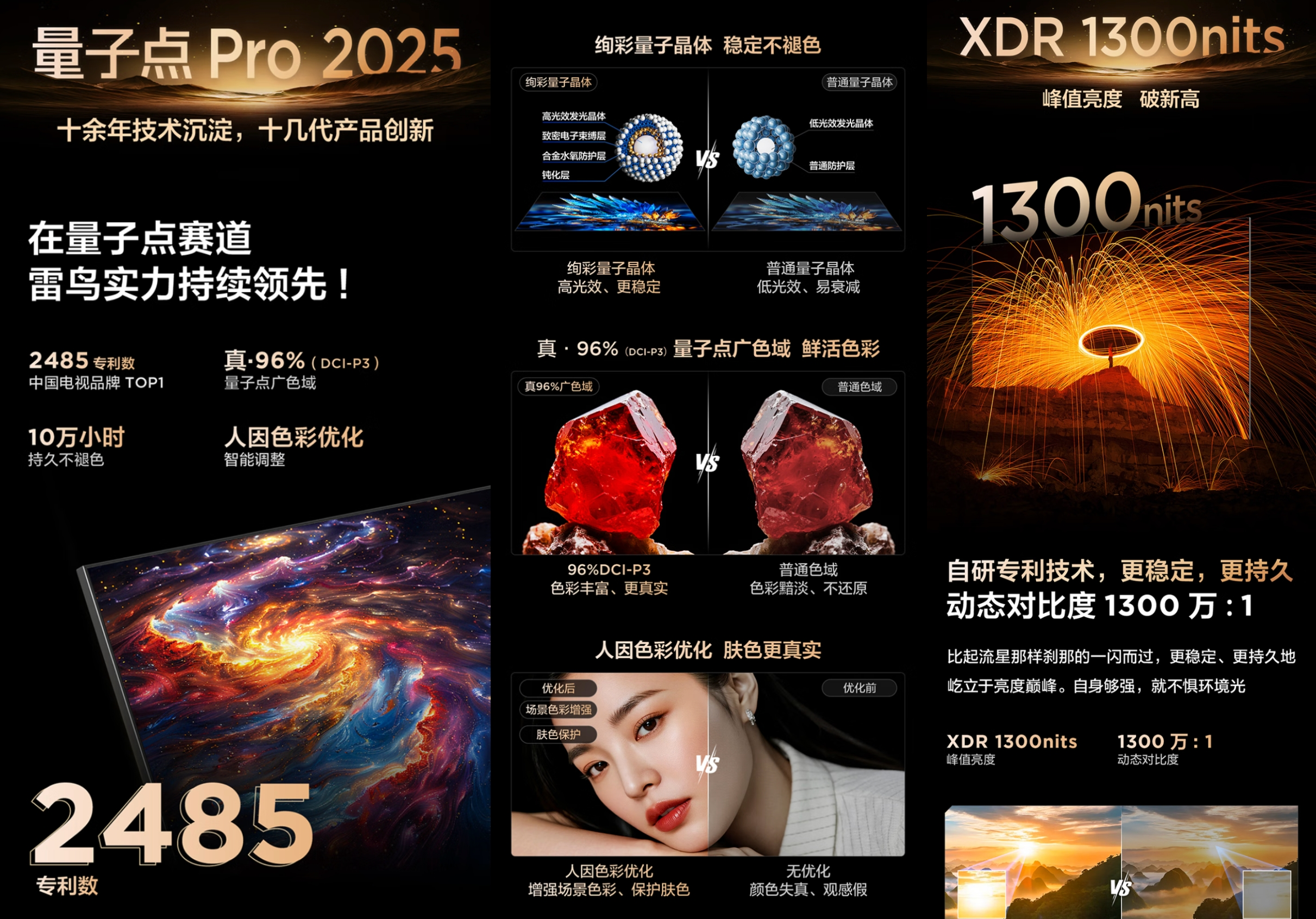 与此同时,搭载TCL集团独家的量子点Pro 2025技术,这项通过十余年技术沉淀,坐拥2485项专利的新技术,能让电视10万小时不褪色,也让雷鸟电视实现在量子点赛道的领先优势。