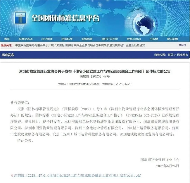 2025年7月18日,深圳市物业管理行业协会八届五次理事会暨六次常务理事会正式发布国内首个《住宅小区党建工作与物业服务融合工作指引》(T/SZPMIA 002-2025)团体标准,为党建引领下的物业服务融入基层社会治理提供了系统性操作指南。