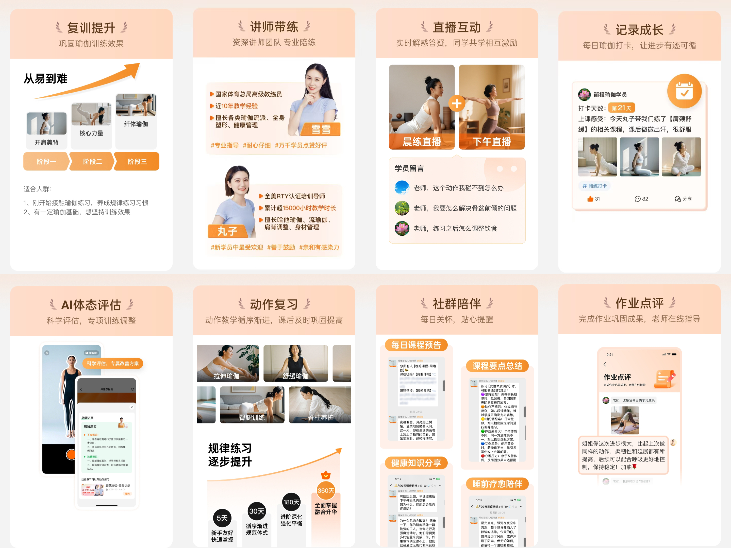 针对银发群体对动作准确性与学习陪伴感的两大核心痛点,简橙瑜伽创新整合智能科技工具与全方位陪伴式服务体系,打造"流畅、温暖、高效"的在线学习空间。