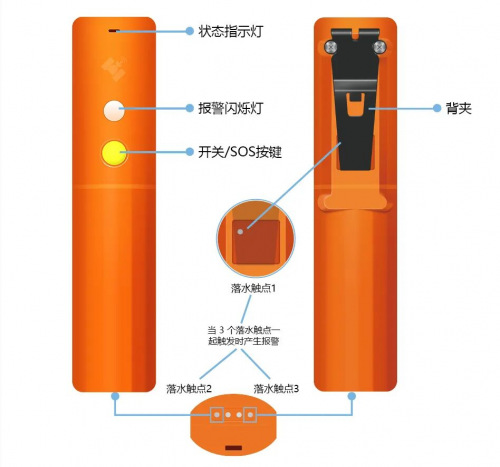 在紧急情况下,使用者可主动一键SOS报警;设备具备落水检测,同时支持淡水和海水,人员落水后无需手动干预,终端落水后3秒内自动开机并触发求救信号。