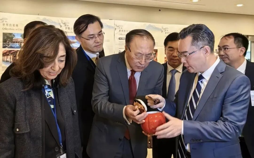 图:中国常驻联合国代表张军(中)等嘉宾在联合国总部听取国家级非遗传承人、八马茶业董事长王文礼(右二)介绍八马东湖之光·赛珍珠铁观音(转自八马茶业)