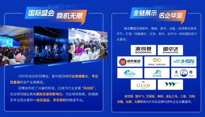 第27届中国国际羽绒博览会不仅是一场行业的盛会,一次产业的深度对话与资源整合,更是我国羽绒产业在秋冬消费热潮前的一次动员与检阅。无论是寻求供应链伙伴、洞察市场趋势、拓展品牌影响力,还是预热羽绒制品消费市场,这里都将成为全球羽绒从业者不可错过的战略高地。