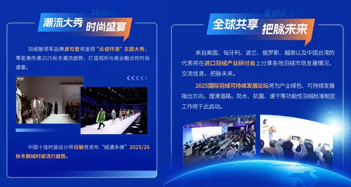 当前,中国羽绒产业正处在转型升级的关键时期。数字化、智能化成为行业发展的新引擎,消费者对品质、环保、功能、设计等方面的多元需求,持续推动产业向高端化、个性化、可持续方向发展。羽博会作为行业交流与成果展示的重要平台,不仅呈现当前技术、设计与商业模式的创新实践,也为企业转型升级提供参考路径与合作机遇。