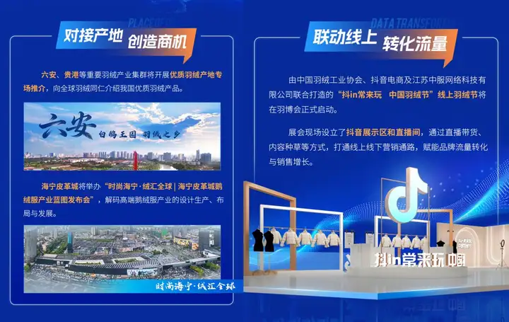 此外,由中国羽绒工业协会、抖音电商及江苏中服网络科技有限公司联合打造的“抖in常来玩 中国羽绒节”线上羽绒节也将在羽博会上正式启动。展会现场设立了抖音展示区和直播间,通过直播带货、内容种草等方式,打通线上线下营销通路,赋能品牌流量转化与销售增长。