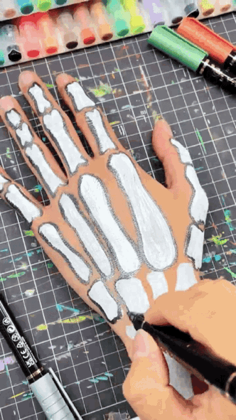 从手指到手腕,笔尖轻触皮肤,银白色墨水顺着手臂线条勾勒出骨骼的走向,轮廓处用黑色叠加,让骨骼仿佛从皮肤下“浮现”。举起手臂转动,骨骼随着动作呈现出不同角度的立体感,这不是医学解剖图,而是用一支中国马克笔“拓印”在手臂上的骨骼“纹身”。