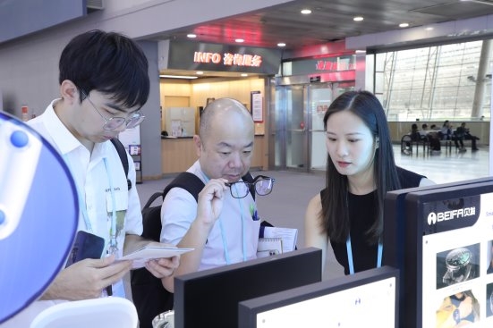 “我们的外贸语料库更丰富,能精准翻译‘FOB条款’等贸易术语。同时,我们的产品性价比更高,以AI眼镜为例,市面上的通用产品会叠加拍照、导航、社交等功能,导致价格居高不下,而我们砍掉冗余的属性,以1000元以内普通眼镜的价格,达到专业翻译机的效果。”现场业务人员介绍道。此次贝发展位最引人注目的当属首次亮相的AI交互数字人。该产品融合自然语言处理、机器学习等前沿技术,可实现多语种对话、产品讲解、展位引导等全流程服务,其流畅的交互体验引得众多客商排队体验。