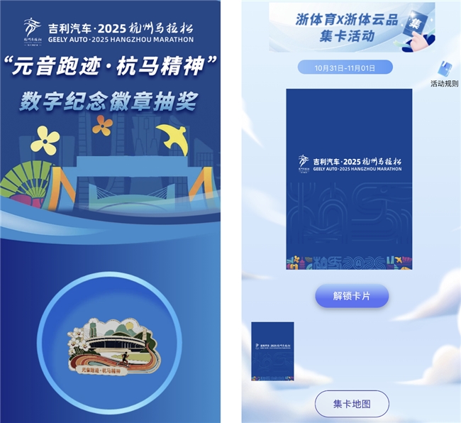 此次活动开通了线上线下双通道获取方式:线下在马博会现场“浙体育”ד浙体云品”展位完成支付宝扫码集卡任务即可前往元音盒数字资产平台领取,每个账号仅限一份,用户可前往线下以及“浙体育”小程序查看活动详情,本渠道限量发行1800份2025杭马“元音跑迹·杭马精神”数字纪念徽章;