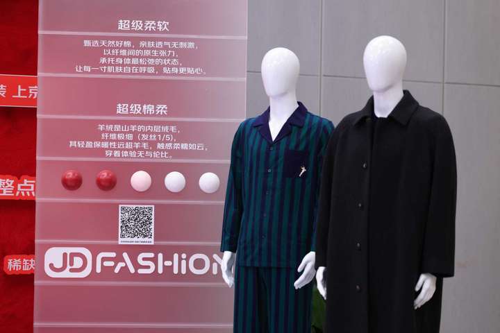 沉浸展按照超级棉柔、超级保暖、超级三防、超级柔软划分为四块特色展区,并对应展出居家棉服、羽绒服、冲锋衣、羊毛羊绒等对应品类产品,数十款带JD FASHION品质标识的热销应季单品吸引了现场不少用户上手体验。