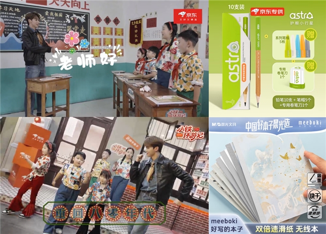 绿墙白窗的教学楼、课桌上的铁皮文具盒、墙上贴着的奖状与“好好学习,天天向上”标语,瞬间将大家拉回80年代的校园时光。在这一时空,唐九洲摇身一变担任老师,为小红领巾们教授趣味课程,还为他们准备了京东专供的10支装中华太空芯铅笔,以及书写速滑又固墨的晨光东方灵韵a5笔记本做课堂笔记。孩子们积极举手与老师互动,没能抢到答题机会的孩子还表示“我blue了”,可爱的模样直接萌翻全场。课程尾声,熟悉的复古音乐响起,大家跟着节奏一起体验80年代的蹦迪文化,萌娃们又奶又拽的模样让欢乐氛围直接拉满!