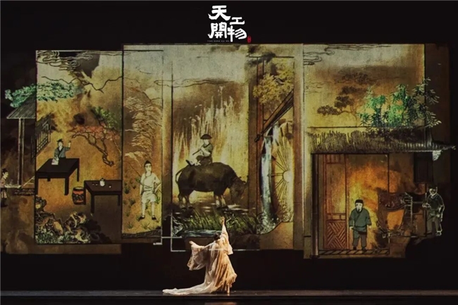 该剧以“大、巧、简”的美学特征著称,被誉为“文艺界的大作,舞剧界的大片”。舞台设计并未简单复刻历史场景,在结合了大量史料考据的基础上,巧妙融合了明代画卷、器物、服饰、建筑等元素,以极具当代性的视觉语汇,对这部百科全书式著作中蕴含的古代工艺智慧、造物哲学进行了创造性的艺术转译,将《天工开物》的科技美学转化为震撼的舞台视觉,将古代工匠的巧思与现代工业美学融为一体。