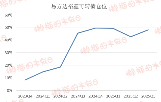 易方达裕鑫的可转债仓位在2024年1季度被从8.4%提到14.82%,之后也持续提升,2024年3季度加到45.49%,并在之后的几个季度中始终保持在40%+的位置。