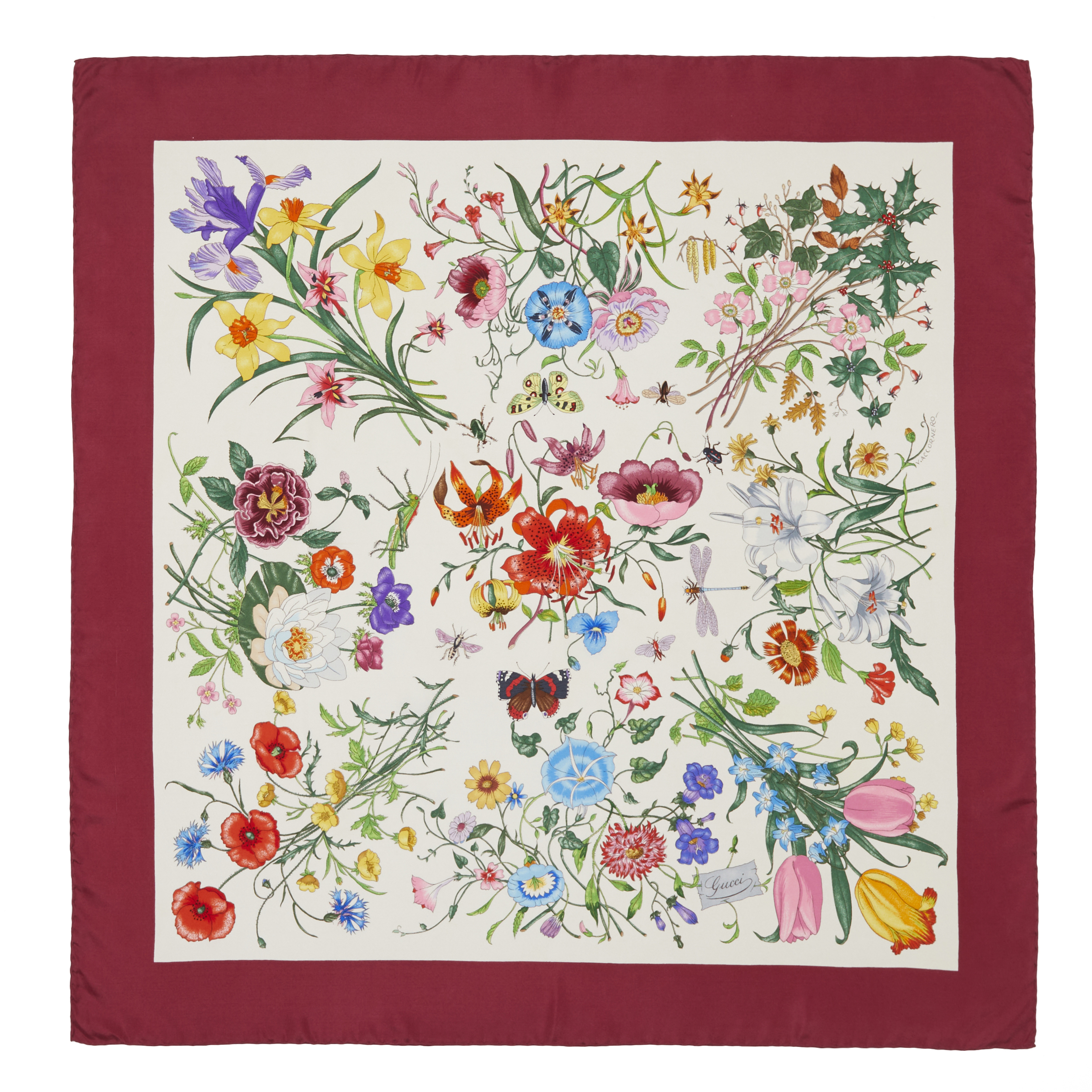 诞生于1966年的Flora花卉图案丝巾,是古驰最具代表性的设计之一,最初为致敬摩纳哥王妃而打造。当时,Rodolfo Gucci希望为王妃献上一份特别的礼物,而Vittorio Accornero de Testa在短短一周内便完成了这件精美佳作。这款丝巾由27种花卉为主体,搭配浆果、蝴蝶和昆虫组成了田园美景;共运用了37种颜色,每一种颜色均需经由独立印染工序。这一经典主题设计的影响力迅速扩散,并于1969年衍生出首款古驰桑蚕丝连衣裙。多年来,历任创作总监均从个人视角诠释Flora花卉图案的主题,于隽永魅力中融入新的创意。